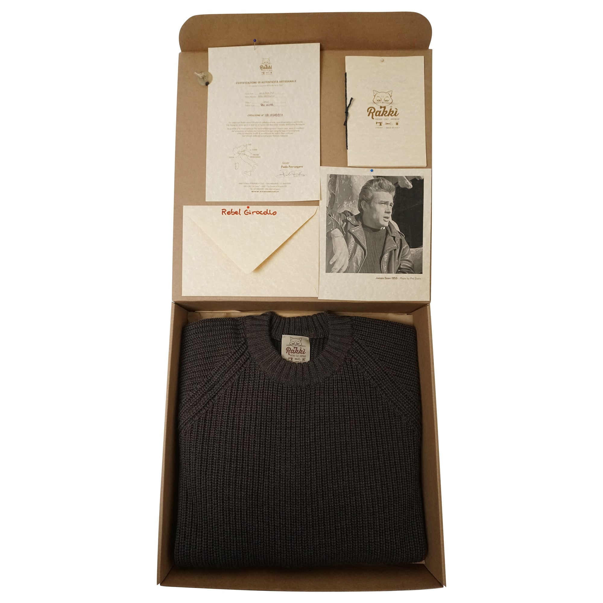 Rakkì Rebel Girocollo James Dean — Maglione girocollo artigianale in lana Cashwool® Zegna Baruffa, lavorato a punto inglese con spalla raglan e rifiniture a cannolè su fondo e polsi. Ispirato al modello indossato da James Dean nel 1955, unisce eleganza sartoriale e fascino retrò in un capo Made in Italy dal taglio regolare.