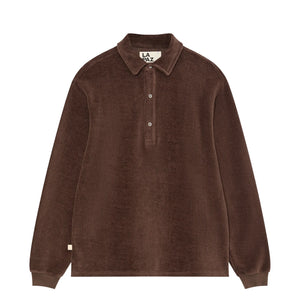 Long-sleeved polo shirt in velvety ribbed fabric, soft to the touch and warm to wear. Sporty silhouette with a subtle vintage touch. Midweight fabric, regular fit, and true to size. Pre-shrunk to reduce shrinkage.