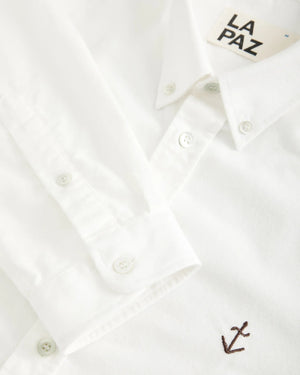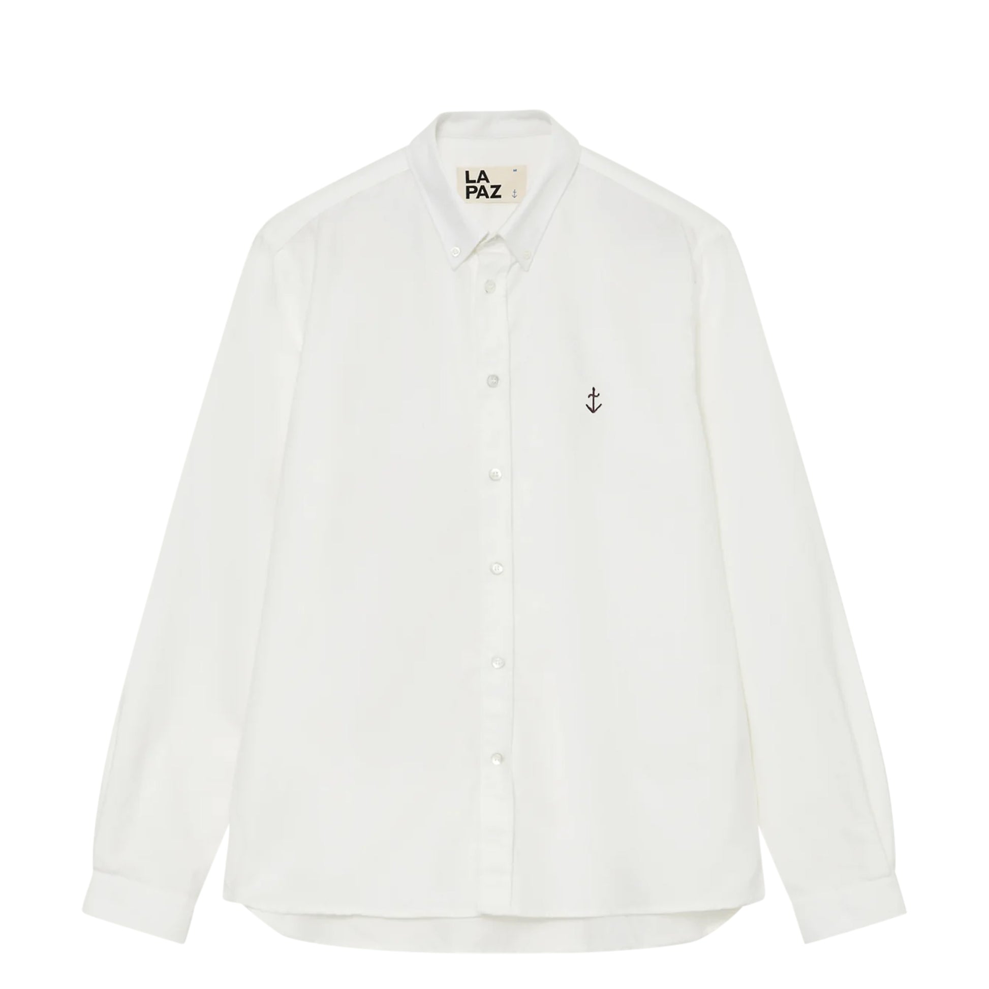 Classic button-down shirt with discreet anchor embroidery on the chest, a subtle nod to nautical tradition. Midweight fabric, regular fit, mother-of-pearl buttons, pre-washed to reduce shrinkage.