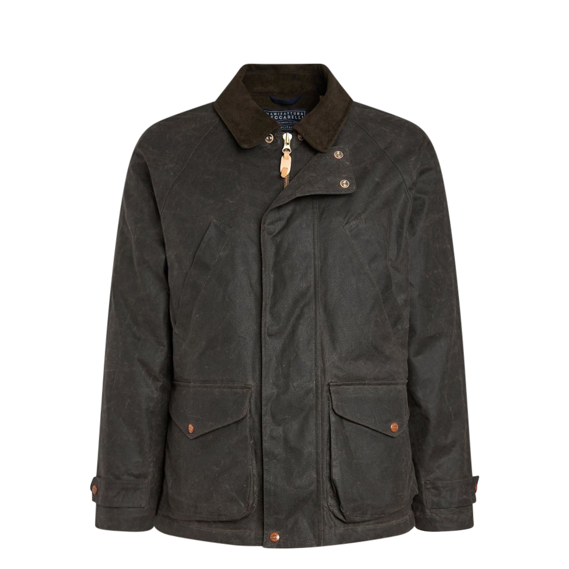 Water-repellent paraffin cotton jacket. Quilted cotton lining with Italian wool padding, cupro sleeves. Multiple zip and flap pockets, moleskin collar, back vents with buttons, natural leather details. Made in Italy with passion.