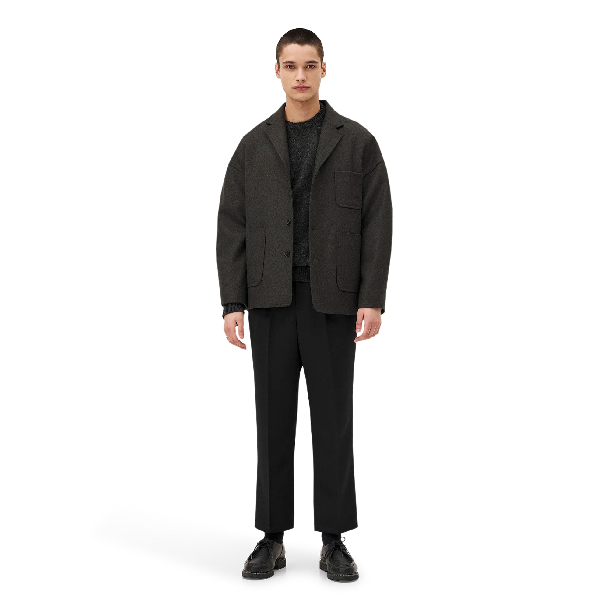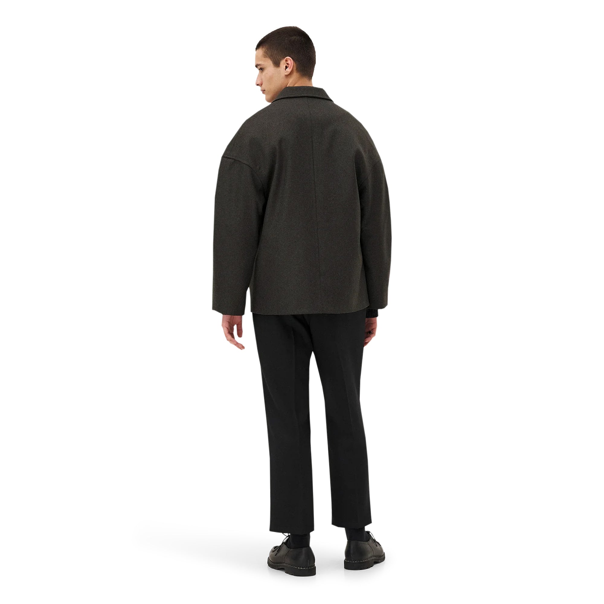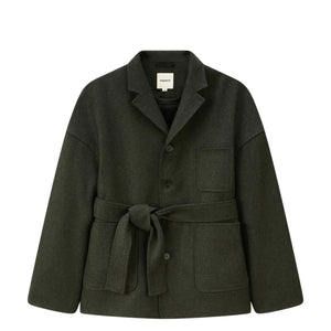 Short coat in recycled wool and cashmere, with slanted sleeves and a relaxed fit. It features a classic collar, patch pockets, and a removable belt. Lining in FSC-certified organic cotton and viscose, with vegetable ivory buttons.