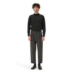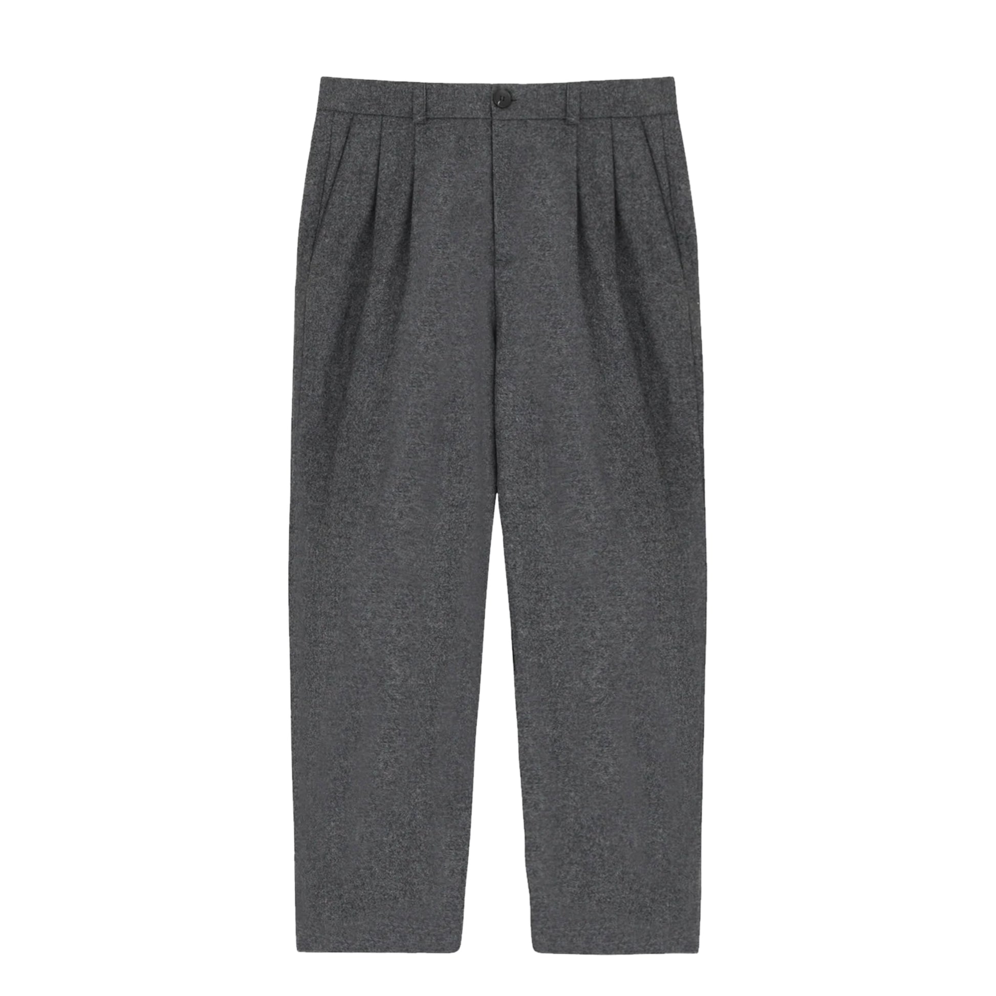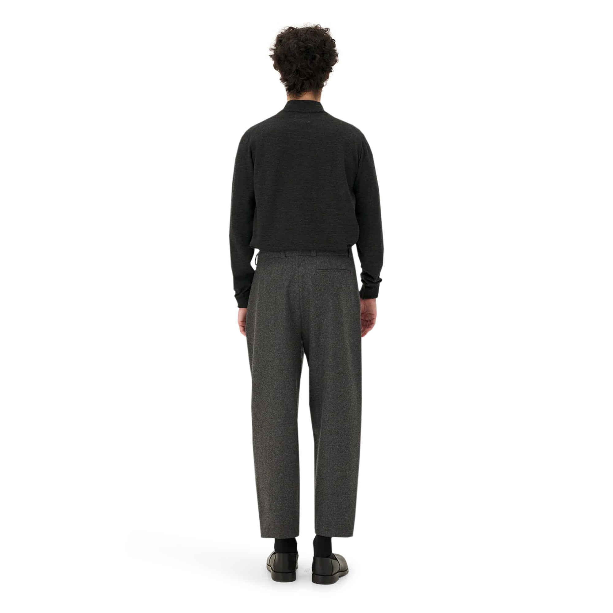 Soft Portuguese melange wool flannel trousers with double pleats and a carrot cut, wide at the top and tapered at the bottom. Front Italian pockets, a back welt pocket, and a zip and button closure.