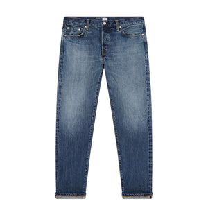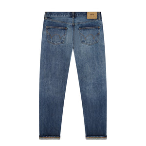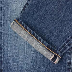 Regular tapered jeans inspired by traditional Japanese denim. Made from recycled 14oz Kurabo Red Selvage Denim, they feature a dark blue vintage wash with a soft hand and fluid structure. Regular tapered fit with a mid-rise, five-pocket design with button closure, and a 100% cellulose paper patch on the back.
