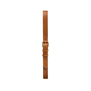This belt is crafted from full-grain, vegetable-tanned leather, designed to improve with age and wear. Double loops keep the end neat, while the leather-covered buckle at the pin attachment adds a refined aesthetic. Metal buckle with embossed Nudie Jeans logo.