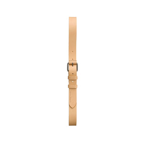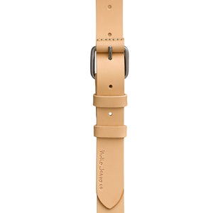 This belt is crafted from full-grain, vegetable-tanned leather, designed to improve with age and wear. Double loops keep the end neat, while the leather-covered buckle at the pin attachment adds a refined aesthetic. Metal buckle with embossed Nudie Jeans logo.
