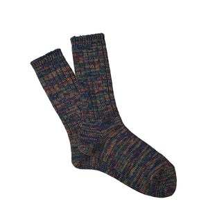 I calzini 5-Color Mix Crew di Anonymous Ism uniscono artigianalità e qualità. Realizzati con filati pettinati e una tecnica over-gauge su macchine low-gauge, offrono morbidezza, spessore e durata, mentre cinque colori si intrecciano creando un motivo vivo e distintivo. Taglia L: lunghezza 29,2 cm (11,5")