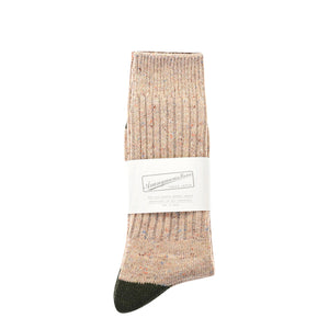 Calze 5-Color Mix Crew a costina, lunghezza 29 cm. Realizzate in filato riciclato (62% acrilico, 18% lana, 17% poliestere, 2% nylon, 1% spandex), spessore spesso. Taglia unica: piedi 27-29 cm (US Uomo 9-12). Made in Japan.