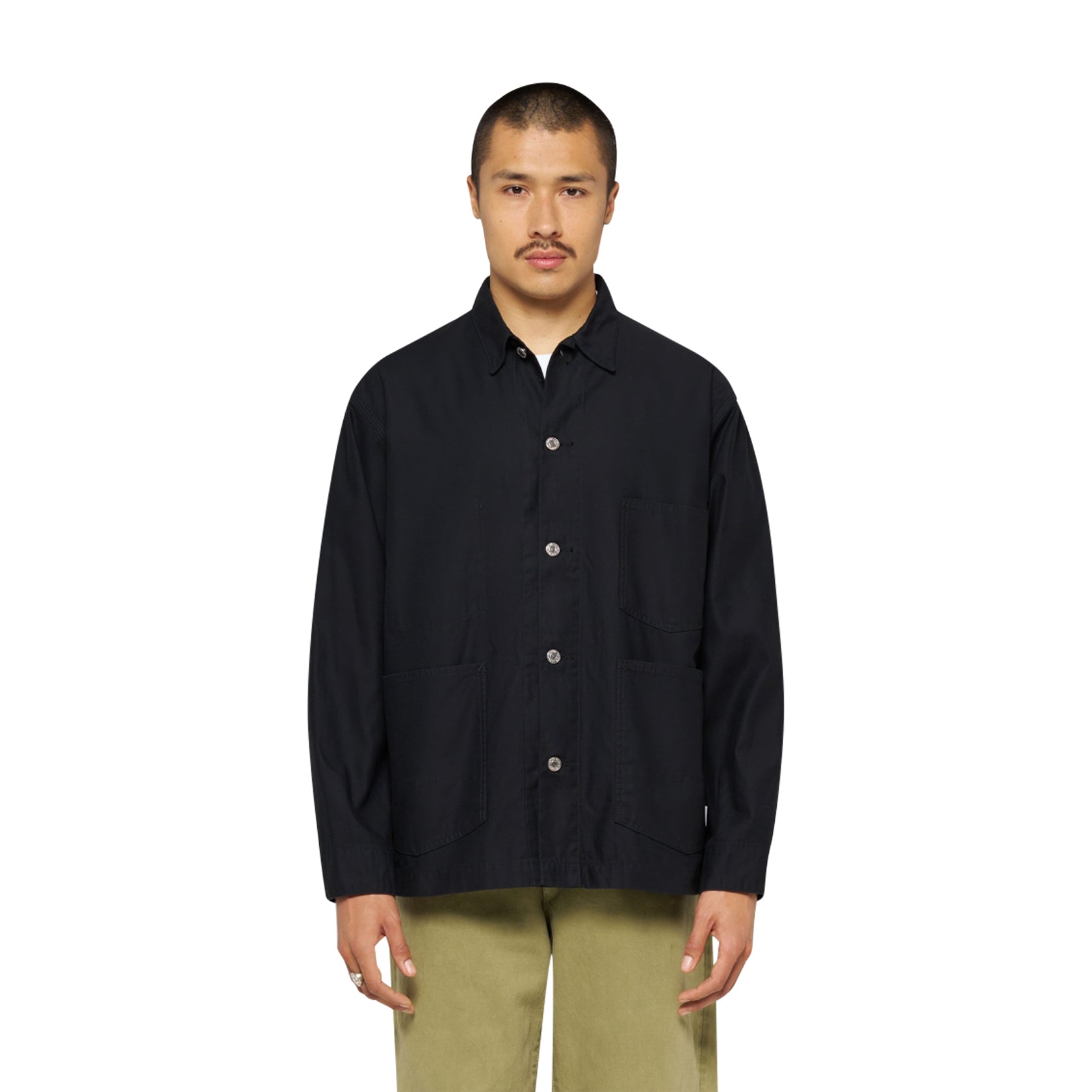 Coverall ispirata al classico workwear, realizzata in resistente Military Cloth Back Satin da 214 g/m² in 100% cotone. Presentata in nero, ha una vestibilità oversize ideale per il layering. Il design con tre tasche è completato da bottoni piatti in metallo argentato, per un look funzionale e contemporaneo.