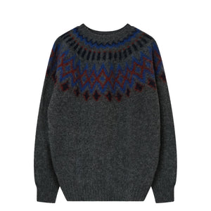 Il maglione “Future Fantasy” di Howlin’ celebra la tradizione scozzese: lana delle Highlands e motivo Fair Isle colorato. Filati densi e spazzolati per una mano morbida, vestibilità regular ideale per il layering.