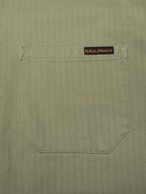 Giacca chore a vestibilità regolare dal design pulito e funzionale, con una tasca sul petto, una tasca interna capiente e due tasche frontali. Le tasche sono rinforzate con cuciture a triangolo, mentre le cuciture principali a doppio ago garantiscono solidità e durata. Realizzata in herringbone twill tinto in capo blu profondo, leggermente rigido al tatto, con lavaggio delicato che ne esalta il carattere workwear vintage.