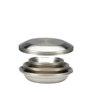 Set da tavola Family progettato in Giappone in acciaio inox da 0,4 mm: leggero, resistente e antiruggine. Ideale per gruppi numerosi a casa o in campeggio. Include 4 set completi (16 pezzi totali). Impilabile e riponibile nella sacca in mesh.